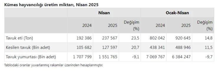 Nisan ayında bir önceki yılın aynı ayına göre, tavuk yumurtası üretimi yüzde 9,1 azaldı, kesilen tavuk sayısı yüzde 20,7 arttı, tavuk eti üretimi yüzde 23,5 arttı. Ocak-Nisan döneminde bir önceki yılın aynı dönemine göre, tavuk yumurtası üretimi yüzde 9,7 azaldı, kesilen tavuk sayısı yüzde 11,5 arttı, tavuk eti üretimi yüzde 14,8 arttı.