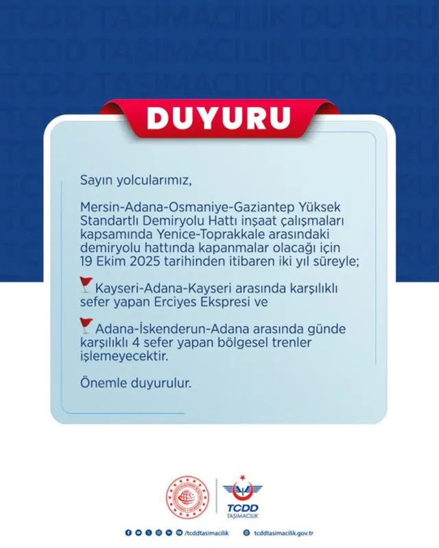 Bu kapsamda, 19 Ekim 2025'ten itibaren 2 yıl süreyle Erciyes Ekspresi ve Adana-İskenderun bölgesel tren seferleri yapılmayacak.
