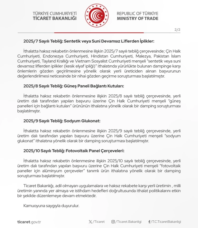 Bakanlık tarafından yayımlanan 2025/7, 2025/8, 2025/9 ve 2025/10 sayılı tebliğler, yerli üreticilerin dampingli ithalat karşısında korunmasını ve ticarette adil şartların sağlanmasını hedeflenirken, yayımlanan tebliğler, özellikle Çin menşeli ürünlere odaklandı.