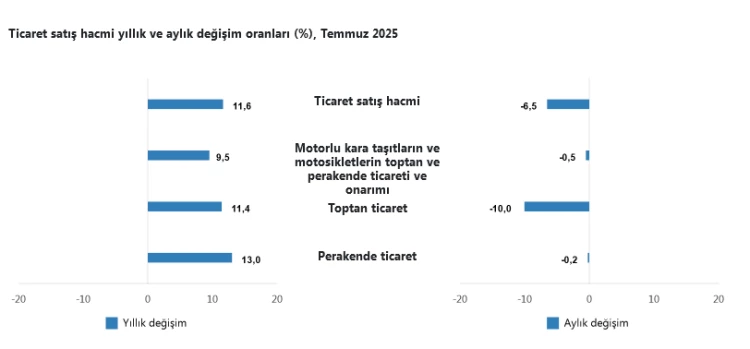 Türkiye İstatistik Kurumu (TÜİK) verilerine göre, Temmuz 2025'te ticaret satış hacmi yıllık bazda yüzde 11,6, perakende satış hacmi ise yüzde 13 yükseldi. Ancak aylık bazda ticaret satış hacmi yüzde 6,5, perakende satış hacmi yüzde 0,2 geriledi.