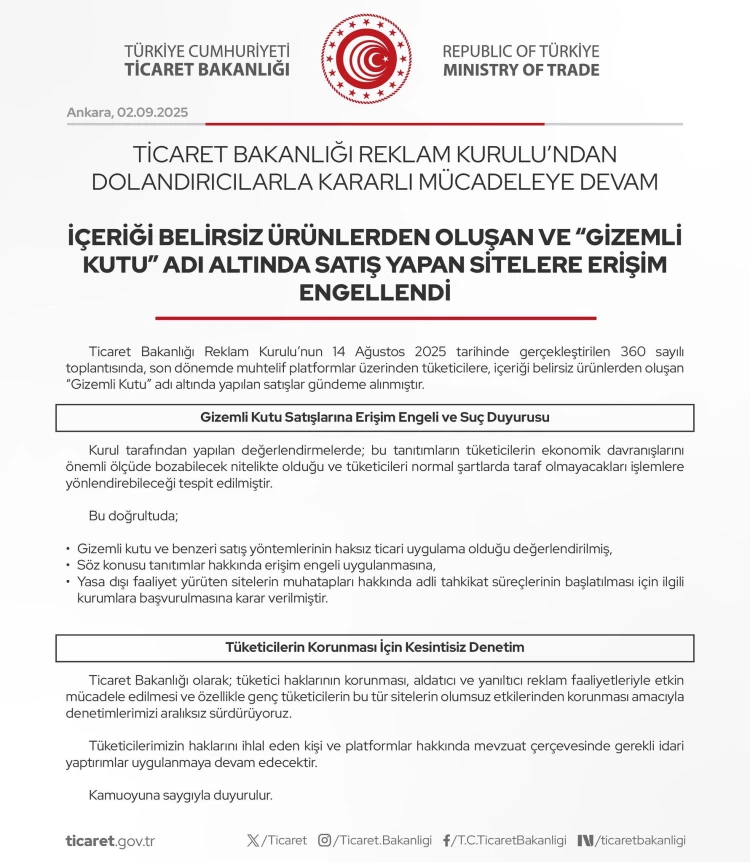Ticaret Bakanlığı Reklam Kurulu, "Gizemli Kutu" adı altında yapılan yanıltıcı satışlara erişim engeli getirilmesi ve sorumlular hakkında suç duyurusunda bulunulması kararı aldı. Tüketicilerin korunması için denetimlerin süreceği vurgulandı.