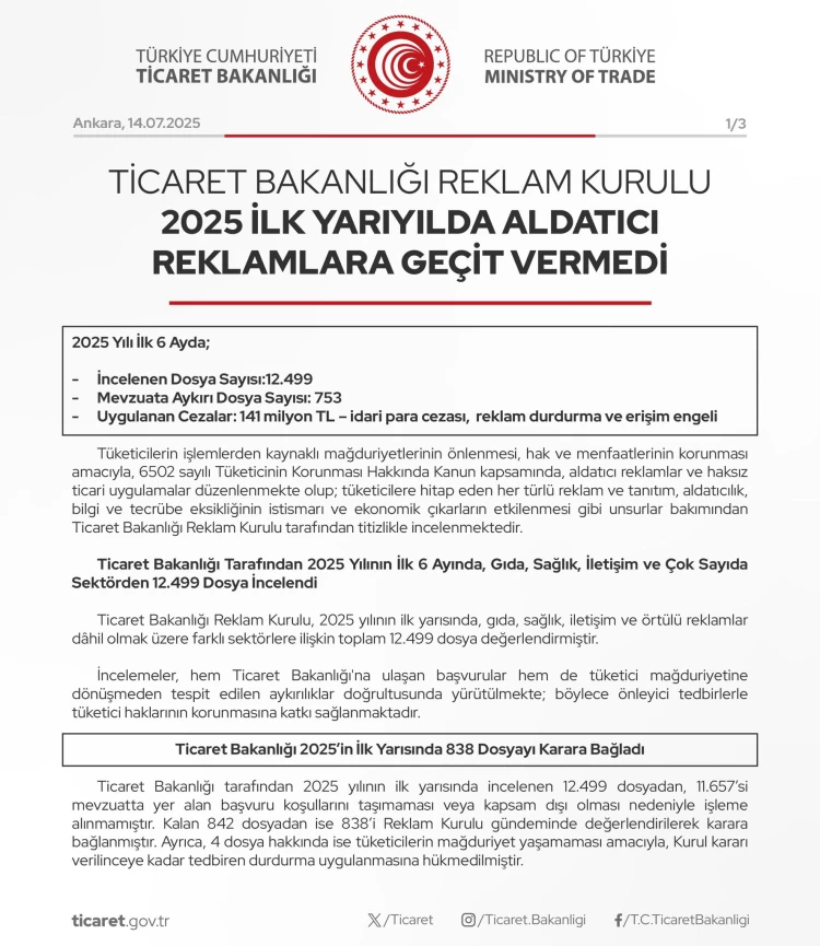 Ticaret Bakanlığı Reklam Kurulu, 2025'in ilk altı ayında 12.499 dosyayı inceleyerek 753'üne 141 milyon TL'yi aşan idari para cezası uyguladı, tüketicileri yanıltan reklamlara geçit vermedi.