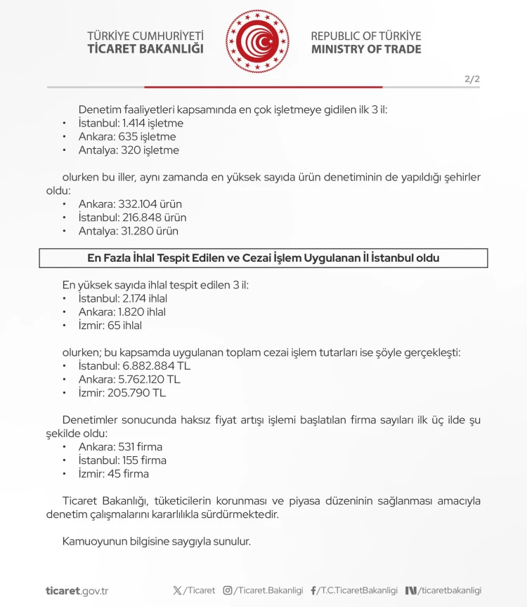 En fazla işletme denetimi İstanbul'da (1.414), Ankara'da (635) ve Antalya'da (320) yapıldı. Ürün denetiminde ise Ankara 332.104, İstanbul 216.848 ve Antalya 31.280 ürünle öne çıktı.
