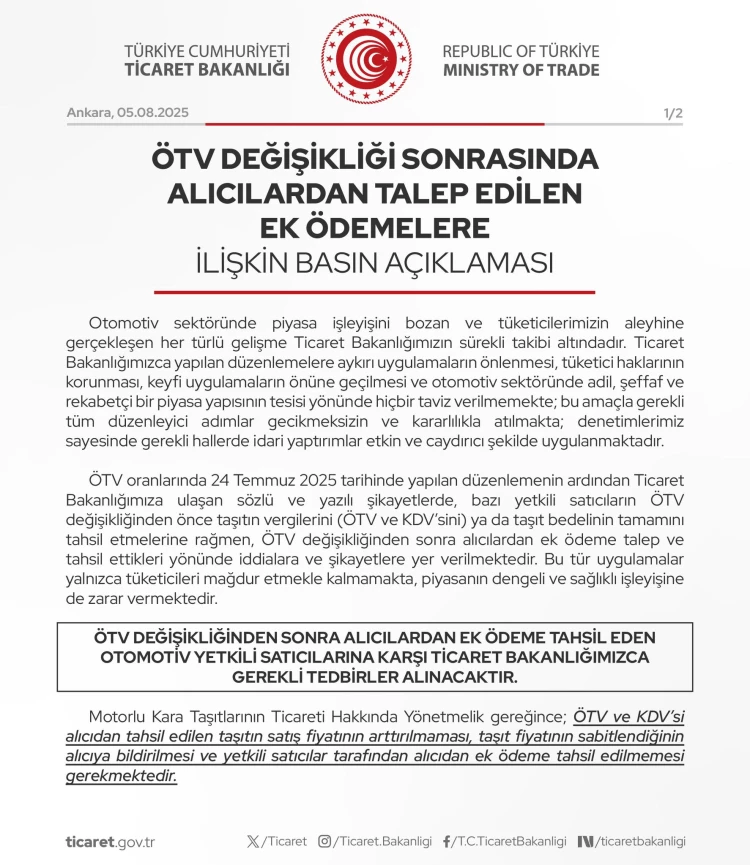 ANKARA (İGFA) - Ticaret Bakanlığı, ÖTV oranlarındaki 24 Temmuz 2025 değişikliği sonrası otomotiv sektöründe yaşanan sorunlara ilişkin bir basın açıklaması yayımladı.