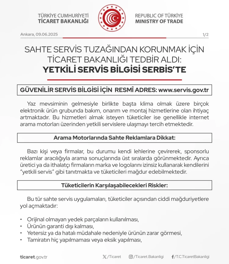 Sahte servislerle mücadele kapsamında denetimlerini sürdüreceğini ve gerekli idari yaptırımların uygulanacağını vurgulayan Bakanlık, vatandaşlara yetkili servis hizmeti almadan önce ürünün üretici veya ithalatçı firma bilgilerini kontrol etmeleri ve www.servis.gov.tr adresini kullanmaları çağrısında bulundu.