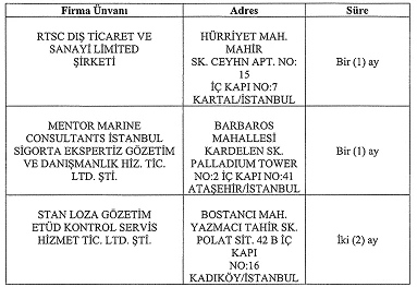 Tebliğe göre, 31 Aralık 2014 tarihli ve 29222 sayılı Resmi Gazete'de yayımlanan Uluslararası Gözetim Şirketi Statüsüne İlişkin Tebliğ (Ürün Güvenliği ve Denetimi: 2015/24) hükümlerine aykırı davrandığı tespit edilen RTSC Dış Ticaret ve Sanayi Limited Şirketi ile Mentor Marine Consultants İstanbul Sigorta Ekspertiz Gözetim ve Danışmanlık Hizmeti Ticaret Limited Şirketi'nin faaliyetleri 1'er ay, Stan Loza Gözetim Etüd Kontrol Servis Hizmet Ticaret Limited Şirketi'nin faaliyetleri ise 2 ay süreyle durduruldu.