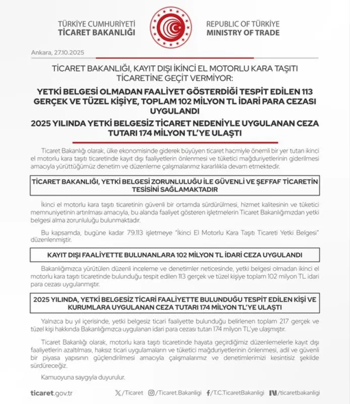 Bu kapsamda, bugüne kadar 79 bin 113 işletmeye "İkinci El Motorlu Kara Taşıtı Ticareti Yetki Belgesi" düzenlendiğini açıklayan Bakanlık, kayıt dışı ticaretle mücadelede 276 milyon TL ceza kesildiğini açıkladı. Bakanlık, yetki belgesi olmadan ticari faaliyette bulunan kişi ve işletmelere yönelik yaptığı denetimlerde önemli sonuçlar elde ederken, yetki belgesi olmadan ikinci el araç ticareti yaptığı tespit edilen 113 kişi ve kuruluşa toplam 102 milyon TL, 2025 yılı içerisinde ise 217 kişi ve kuruluşa 174 milyon TL idari para cezası uygulandığı duyuruldu.