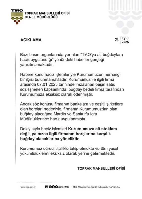 TMO, "Dolayısıyla haciz işlemleri Kurumumuza ait stoklara değil, yalnızca ilgili firmanın borçlarına karşılık buğday alacaklarına yöneliktir. Habere konu haciz işlemleriyle Kurumumuzun herhangi bir ilgisi bulunmamaktadır" diyerek kamuoyunu bilgilendirdi.