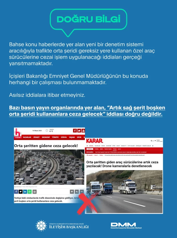 ANKARA (İGFA) - İletişim Başkanlığı bünyesindeki Dezenformasyonla Mücadele Merkezi, sağ şerit boşken orta şeridi kullananlara ceza geleceği iddialarına ilişkin açıklama yaptı.