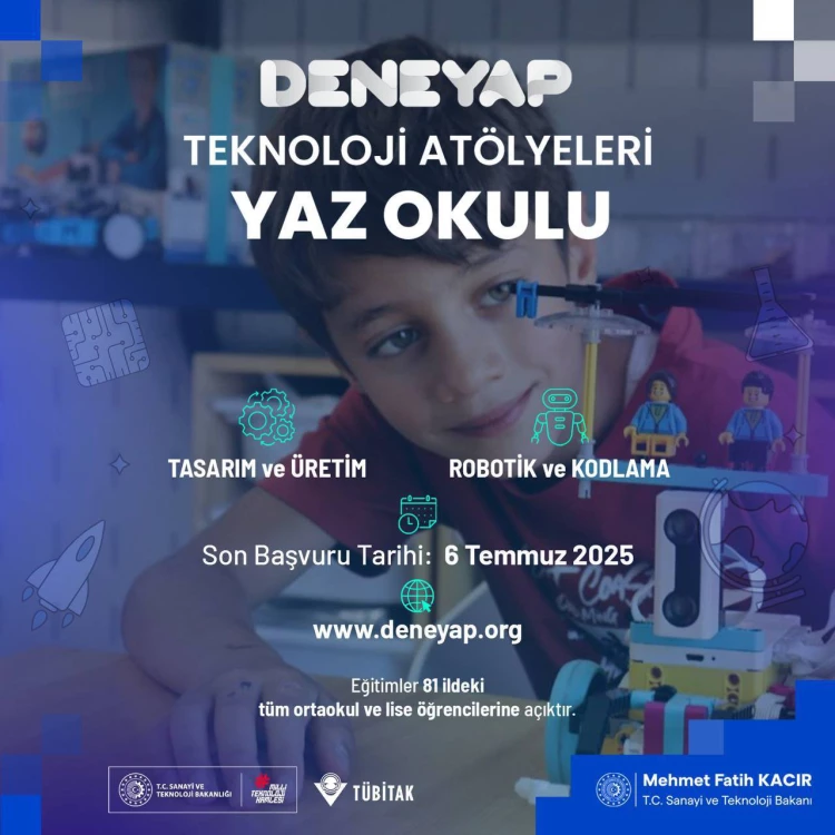 Bakan Kacır, DENEYAP Türkiye Yaz Okulu'nun da 14 Temmuz-22 Ağustos 2025 tarihlerinde 81 ilde ortaokul ve lise öğrencilerine Tasarım-Üretim ile Robotik-Kodlama eğitimleri vereceğini belirtirken, "Tatillerini merak, araştırma ve üretimle zenginleştirmek isteyen tüm öğrencilerimizi bekliyoruz" diyerek gençleri bu fırsatı değerlendirmeye çağırdı.