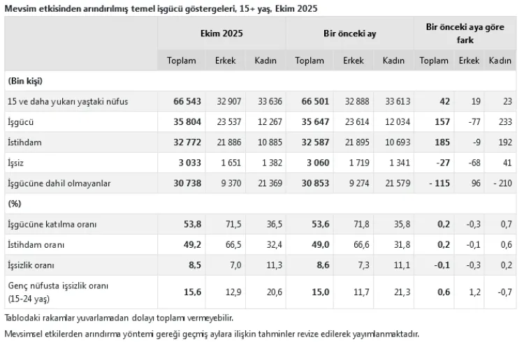 Ekim ayında istihdam edilenlerin sayısı 185 bin kişi artarak 32 milyon 772 bine ulaştı. Mevsim etkisinden arındırılmış istihdam oranı yüzde 49,2 olarak kaydedildi. Bu oran erkeklerde yüzde 66,5, kadınlarda ise yüzde 32,4 düzeyinde gerçekleşti.
