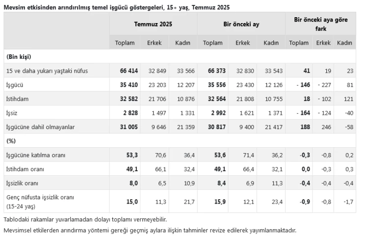 İstihdam ve İşgücü Verileriİstihdam edilenlerin sayısı Temmuz 2025'te 18 bin kişi artarak 32 milyon 582 bin kişiye ulaştı, ancak istihdam oranı yüzde 49,1'de sabit kaldı.