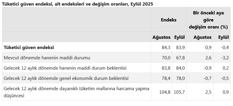 TÜİK, Eylül ayına ilişkin Tüketici Güven Endeksi verilerini açıkladı. Tüketici güven endeksi 83,9 oldu.