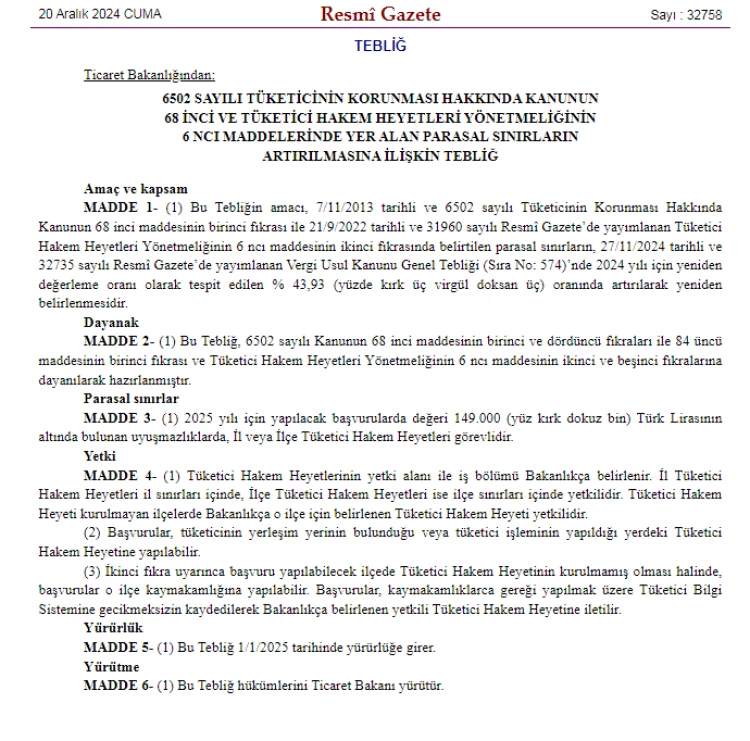 ANKARA (İGFA) - Ticaret Bakanlığı'nca bugünkü Resmi Gazete'de yayımlanan Tüketicilerin Korunması Hakkında Kanunun 68. ve Tüketici Hakem Heyetleri Yönetmeliği'nin 6. maddelerinde yer alan "Parasal Sınırların Artırılmasına İlişkin Tebliğ" ile tüketici hakem heyetlerine yapılacak başvurularda parasal sınır 149 bin TL olarak belirlendi.