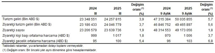 TÜİK verilerine göre, Temmuz–Eylül döneminde Türkiye'nin turizm geliri 24 milyar 257 milyon dolar oldu. Ziyaretçi sayısı da yüzde 1,9 artışla 23,6 milyonu geçti. Ziyaretçiler yüzde 73,8 ile en çok "gezi, eğlence, sportif ve kültürel faaliyetler" amacıyla geldi. Bu çeyrekte ziyaretçilerden elde edilen turizm geliri içerisindeki paket tur harcamalarının payı yüzde 33,6 olurken, bir önceki yılın aynı dönemine göre sağlık harcamaları yüzde 20,3 arttı.