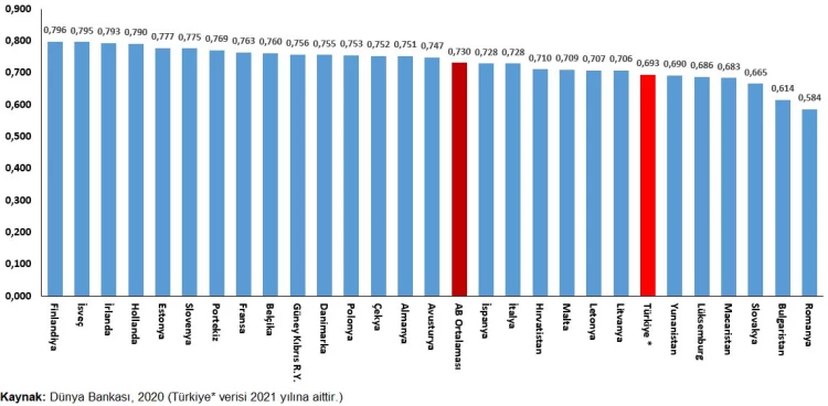 AB-27'de en yüksek Finlandiya (0,796), İsveç (0,795), İrlanda (0,793); en düşük Romanya (0,584), Bulgaristan (0,614), Slovakya (0,665).