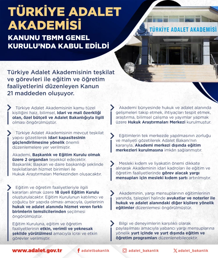 Türkiye Adalet Akademisi Kanunu'nun detaylarına ulaşmak için tıklayabilirsiniz.