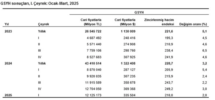TÜİK verilerine göre, 2025 yılı birinci çeyreğinde GSYH yüzde 2 arttı. İnşaat sektörü yüzde 7,3 büyürken, tarım ve sanayi daraldı. Cari fiyatlarla GSYH 12 trilyon 125 milyar TL'ye ulaştı.