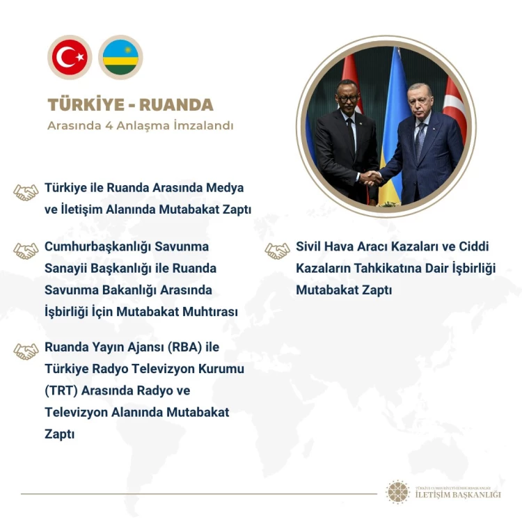 İmzalanan anlaşmalar; "Ruanda Yayın Ajansı (RBA) ile Türkiye Radyo Televizyon Kurumu (TRT) Arasında Radyo ve Televizyon Alanında Mutabakat Zaptı",  "Sivil Hava Aracı Kazaları ve Ciddi Kazaların Tahkikatına Dair İşbirliği Mutabakat Zaptı", "Türkiye ile Ruanda Arasında Medya ve İletişim Alanında Mutabakat Zaptı", "Cumhurbaşkanlığı Savunma Sanayii Başkanlığı ile Ruanda Savunma Bakanlığı Arasında İşbirliği İçin Mutabakat Muhtırası" yer aldı.