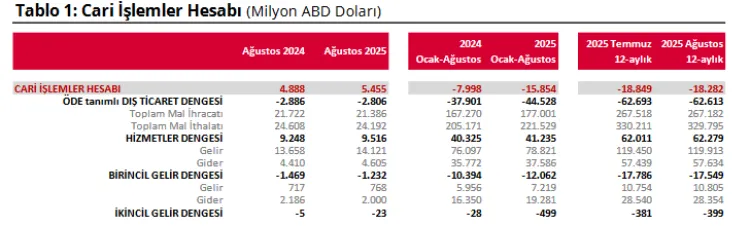 Merkez Bankası, Ağustos ayı Ödemeler Dengesi İstatistikleri'ni yayımladı. Cari işlemler hesabı 5.455 milyon ABD doları fazla verirken, altın ve enerji hariç cari işlemler 10.005 milyon dolar fazla kaydetti. Ödemeler dengesi tanımlı dış ticaret açığı 2.806 milyon dolar olarak gerçekleşti. Yıllıklandırılmış verilere göre cari açık 18,3 milyar dolar, dış ticaret açığı ise 62,6 milyar dolar oldu.