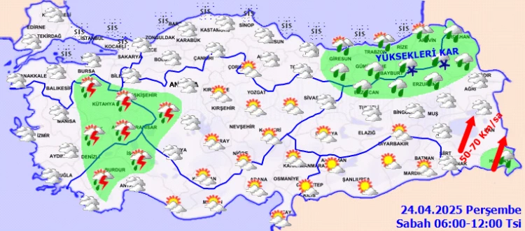Buna göre Türkiye genelinde parçalı ve çok bulutlu hava bekleniyor. Ege, Akdeniz, İç Anadolu, Karadeniz, Doğu Anadolu (Van hariç), Güneydoğu Anadolu, Balıkesir ve Sakarya'da yerel sağanak ve gök gürültülü yağış öngörülüyor. İç Ege, Batı ve Doğu Akdeniz'in Toroslar kesimi, Batı ve Orta Karadeniz'in iç kesimleri, İç Anadolu'nun kuzeybatısı, Zonguldak, Bartın, Tunceli ve Bingöl'de yağışlar yerel olarak kuvvetli olacak. Marmara'nın kuzeyi ve Karadeniz kıyılarında pus ve sis görülebilir.