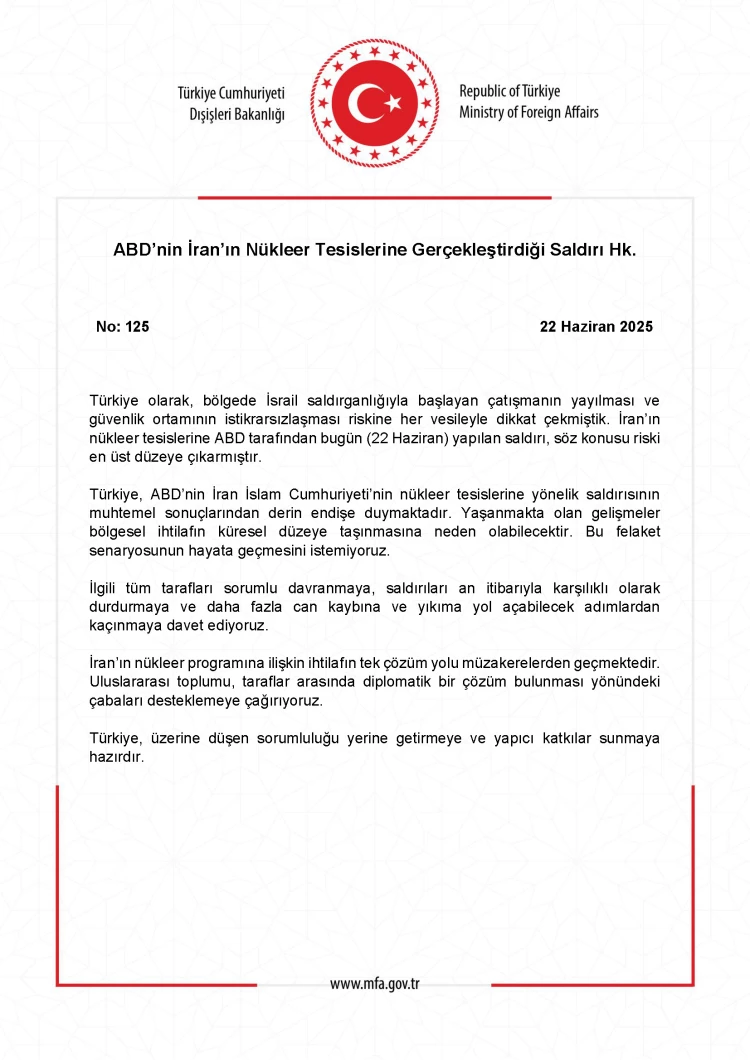 Dışişleri Bakanlığı, ABD'nin İran'ın nükleer tesislerine yönelik 22 Haziran 2025'te gerçekleştirdiği saldırıyı kınadı. Türkiye, saldırının bölgesel istikrarsızlığı artırabileceği uyarısında bulunarak, tarafları sorumlu davranmaya ve diplomatik çözüme odaklanmaya çağırdı.