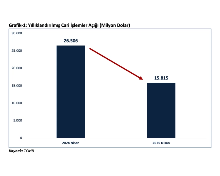 Nisan 2025'te yıllıklandırılmış cari işlemler açığı, 2024'ün aynı ayındaki 26,5 milyar dolardan 15,8 milyar dolara gerileyerek 10,7 milyar dolarlık bir düşüş kaydetti.