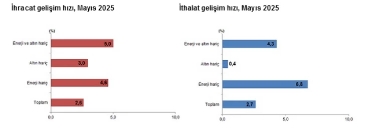 TÜİK ve Ticaret Bakanlığı verilerine göre, 2025 Mayıs'ta ihracat 24,8 milyar dolara, ithalat 31,5 milyar dolara yükseldi; dış ticaret açığı yüzde 2,7 artarak 6,6 milyar dolar oldu.