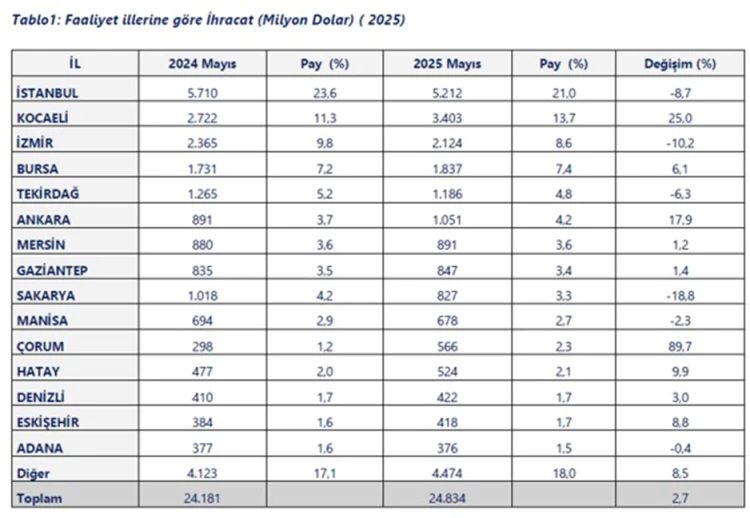 Ticaret Bakanlığı'nın verilerine göre, Mayıs 2025'te İstanbul 5,2 milyar dolarlık ihracatla birinci, Kocaeli 3,4 milyar dolarla ikinci, İzmir ise 2,1 milyar dolarla üçüncü sırada yer aldı. İhracatta en fazla artış gösteren il 681 milyon dolarla Kocaeli oldu. Ocak-Mayıs döneminde 18 il 1 milyar doların üzerinde ihracat gerçekleştirirken, 46 ilde ihracat artışı kaydedildi.