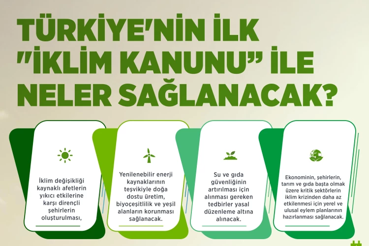 İklim Kanunu ile; iklim değişikliği kaynaklı afetlerin yıkıcı etkilerine karşı dirençli şehirlerin oluşturulması, yenilenebilir enerji kaynaklarının teşvikiyle doğa dostu üretim, biyoçeşitlilik ve yeşil alanların korunması sağlanacak.