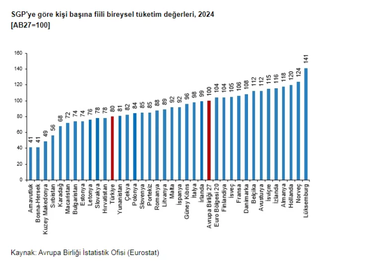 Eurostat'ın 2024 SGP verilerine göre, Türkiye'nin kişi başına GSYH endeksi, 27 AB ülkesinin ortalaması olan 100'ün yüzde 29 altında, 71 seviyesinde gerçekleşti. Fiili bireysel tüketim düzeyi ise AB ortalamasının yüzde 20 gerisinde, 80 olarak kaydedildi. Türkiye'nin fiili bireysel tüketime ilişkin fiyat düzeyi endeksi 47 oldu, bu da Türkiye'nin AB'ye kıyasla "ucuz" bir ülke olduğunu gösterdi.