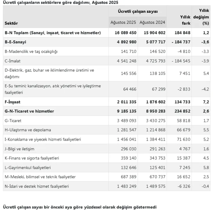 TÜİK'e göre Ağustos ayı verilerine göre ücretli çalışan sayısı yıllık yüzde 1,2 artarak 16 milyon 89 bin 450 oldu. Ticaret-hizmet sektörü yüzde 2,6 büyürken, sanayi yüzde 3,6 azaldı. İnşaatta yüzde 7,2 artış görüldü. İstatistiki verilere göre aylık değişim yaşanmadı.