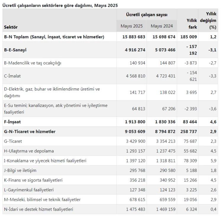 Verilere göre; sanayi, inşaat ve ticaret-hizmet sektörleri toplamında ücretli çalışan sayısı 2025 Mayıs'ta, geçen yılın aynı ayına kıyasla yüzde 1,2 artış gösterdi.