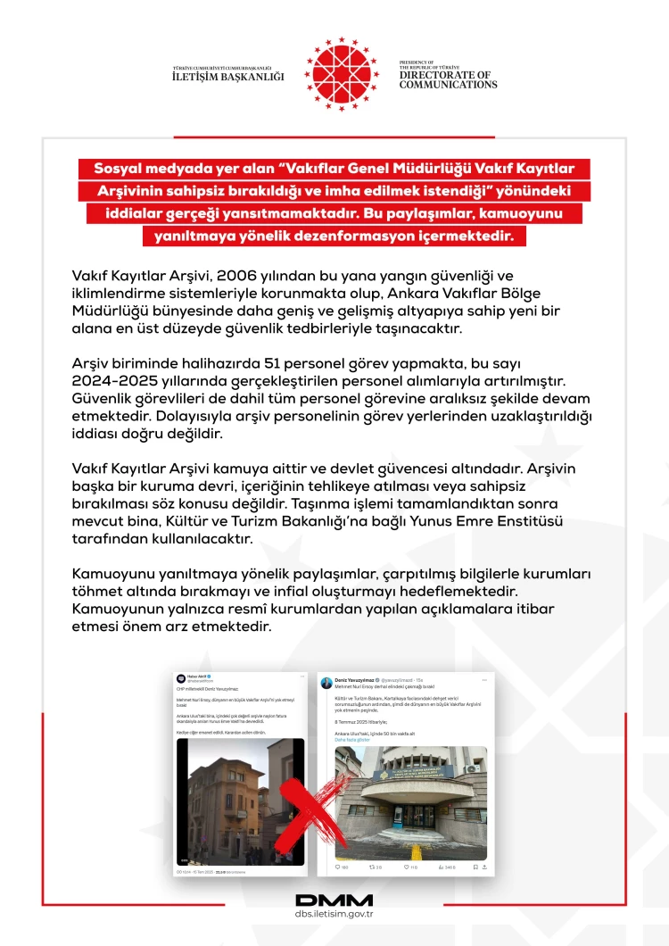 İletişim Başkanlığı Dezenformasyonla Mücadele Merkezi, Vakıflar Genel Müdürlüğü Vakıf Kayıtlar Arşivi'nin imha edildiği iddialarını yalanladı. Vakıf arşivin güvenli şekilde yeni bir alana taşındığı duyuruldu.