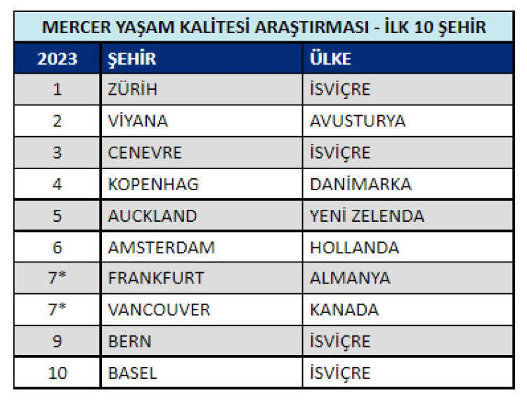 Bu yıl yaşam kalitesi en yüksek şehir Zürih olurken, onu Viyana ve Cenevre takip etti. Kopenhag bir kez daha dördüncü sırayı alırken, Auckland beşinci oldu.