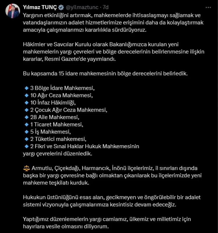 Adalet Bakanı Yılmaz Tunç, Hâkimler ve Savcılar Kurulu'nun (HSK) yeni mahkemelerin yargı çevreleri ve bölge derecelerini belirleyen kararlarının Resmi Gazete'de yayımlandığını duyurdu. Armutlu, Çiçekdağı, Harmancık ve İnönü ilçelerinde yeni mahkeme teşkilatları kurulurken, 15 idare mahkemesi ve çeşitli ihtisas mahkemelerinin yargı çevreleri düzenlendi.