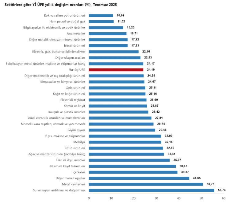 Türkiye İstatistik Kurumu (TÜİK), Temmuz 2025 Yurt İçi Üretici Fiyat Endeksi (Yİ-ÜFE) verilerini açıkladı. Yİ-ÜFE, bir önceki aya göre yüzde 1,73, bir önceki yılın aynı ayına göre yüzde 24,19 artış gösterdi. İmalat ürünlerinde yıllık yüzde 24,02, aylık yüzde 1,60 artış kaydedildi.