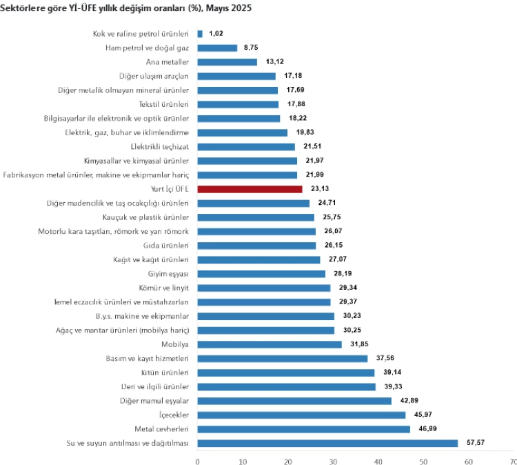 Yurt İçi Üretici Fiyat Endeksi (Yİ-ÜFE), Mayıs 2025'te sanayi sektörlerinde yükselişini sürdürdü, su temini ve enerji öne çıktı.