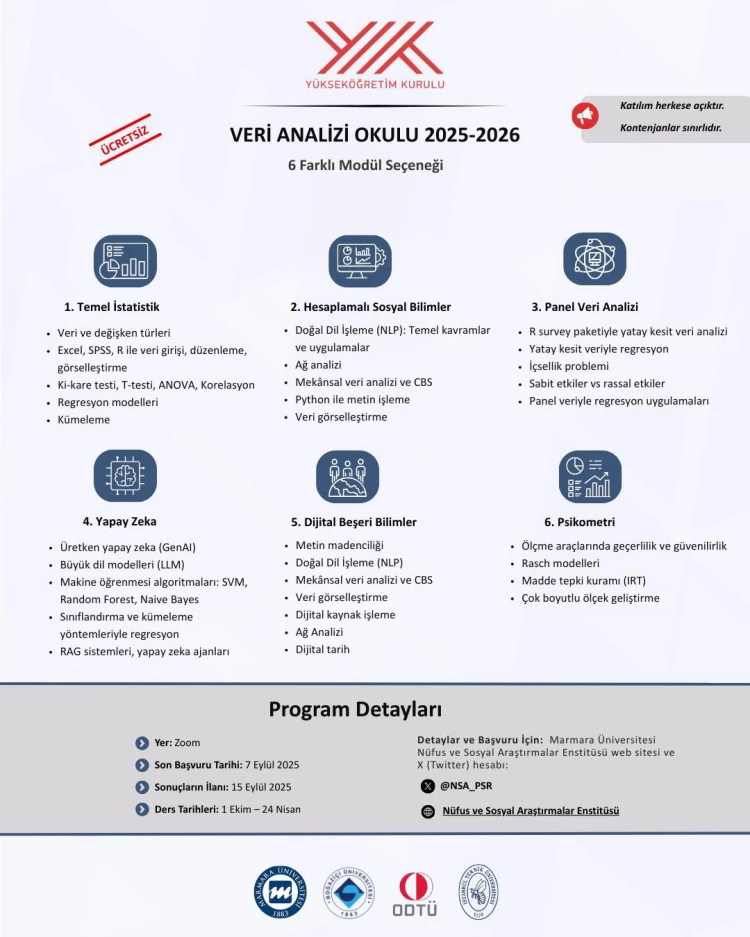 Zoom üzerinden yapılacak dersler için Marmara Üniversitesi Nüfus ve Sosyal Araştırmalar Enstitüsü web sitesi ile son başvuru tarihi 7 Eylül 2025 olarak açıklandı.