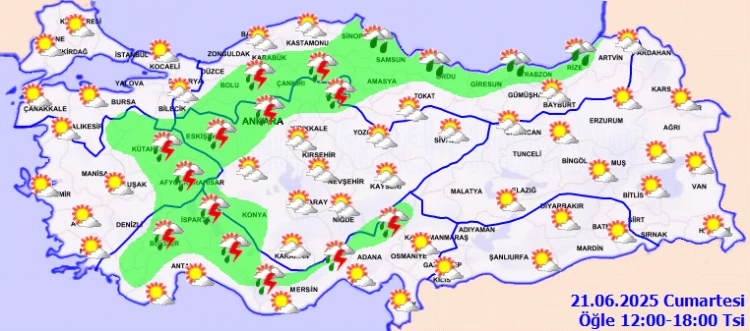 ANKARA (İGFA) - Meteoroloji Genel Müdürlüğü tarafından yapılan tahminlere göre: Ülkemizin kuzey ve iç kesimlerinin parçalı, yer yer çok bulutlu, Marmara'nın güneydoğusu, Göller yöresi, Akdeniz'in Toroslar mevkii, Batı Karadeniz'in iç kesimleri, Orta Karadeniz (Tokat hariç), Doğu Karadeniz kıyıları ile Kütahya, Afyonkarahisar, Ankara, Çankırı, Eskişehir, Konya ve Sinop çevrelerinin yerel olmak üzere sağanak ve gök gürültülü sağanak yağışlı, diğer yerlerin az bulutlu ve açık geçeceği tahmin ediliyor. Rüzgarın Marmara, Kuzey Ege ve İç Anadolu'nun kuzeyinde, kuzeyli yönlerden kuvvetli (40-60km/saat) olarak esmesi bekleniyor.