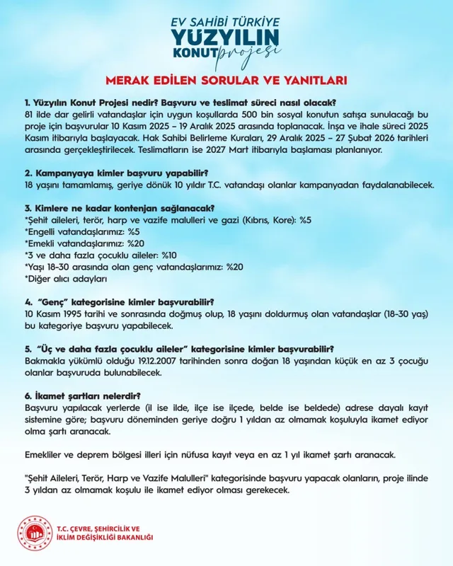 "Yüzyılın Konut Projesi'ne vatandaşların ilgisi büyük olurken, 30 soru ve cevabın yer aldığı paylaşımda merak edilen konular yanıtlandı.