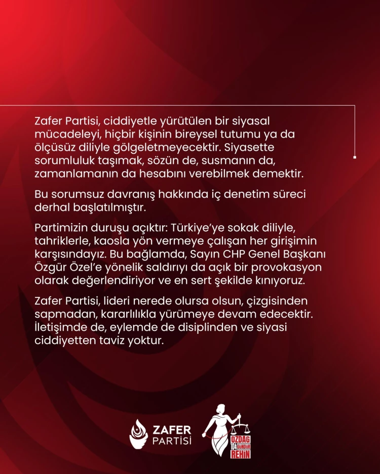 Öte yandan Türkiye'de sokak diliyle ve tahriklerle kaos yaratma çabalarına karşı olduklarını vurgulayan Zafer Partisi, CHP Genel Başkanı Özgür Özel'e yapılan saldırıyı provokasyon olarak nitelendirip sert şekilde kınadı. Zafer Partisi, disiplin ve siyasi ciddiyetten taviz vermeden yoluna devam edeceğini ifade etti.