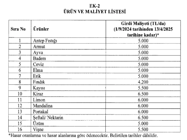 Destek; Antep fıstığı, Armut, Ayva, Badem, Ceviz, Elma, Erik, Fındık, Kayısı, Kiraz, Limon, Mandalina, Portakal, Şeftali/nektarin, Üzüm ve Vişne ürünleri hasarlı çiftçilere verilecek.