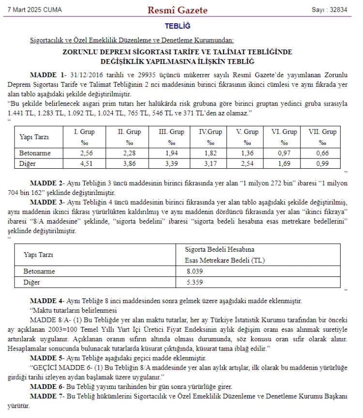 Buna göre; 31 Aralık 2016 tarihli ve 29935 üçüncü mükerrer sayılı Resmî Gazete'de yayımlanan Zorunlu Deprem Sigortası Tarife ve Talimat Tebliğinde yer alan,75 TL, 65 TL, 55 TL, 45 TL ve 35 TL zorunlu deprem sigortası asgari pirim tutarları 1.441 TL, 1.283 TL, 1.092 TL, 1.024 TL, 765 TL, 546 TL ve 371 TL'den az olamaz." şeklinde değiştirildi.