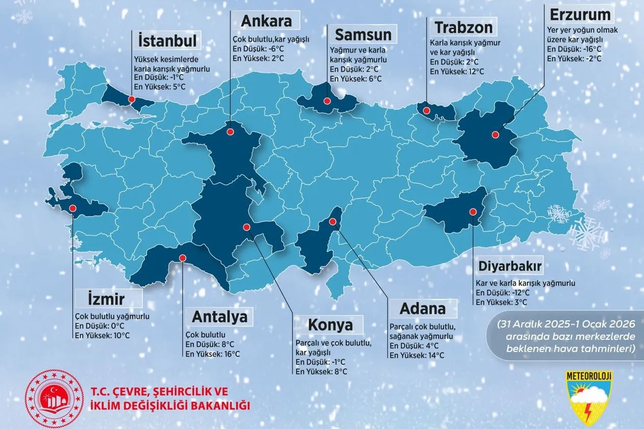 Meteoroloji Genel Müdürlüğü, 2025’in son günü ve yeni yılın ilk gününde Türkiye genelinde soğuk ve yağışlı havanın etkili olacağını duyurdu. Yurt genelinde soğuyan hava ile birlikte kuvvetli yağış, fırtına, buzlanma ve çığ tehlikesine dikkat!