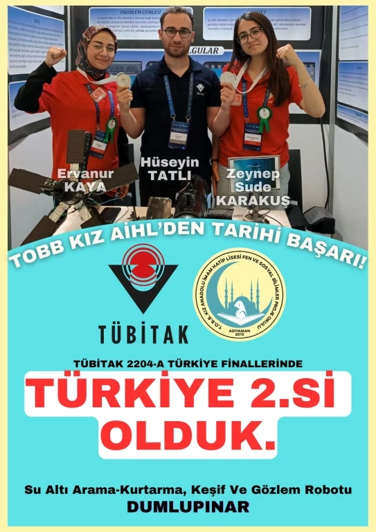 Türkiye genelinden binlerce projenin değerlendirildiği prestijli yarışmada, Adıyaman Türkiye Odalar ve Borsalar Birliği Kız Anadolu İmam Hatip Lisesi öğrencileri Ervanur Kaya ve Zeynep Sude Karakuş, danışman öğretmenleri Hüseyin Tatlı rehberliğinde hazırladıkları “Dumlupınar” isimli projeyle Türkiye 2.si olmayı başardı.