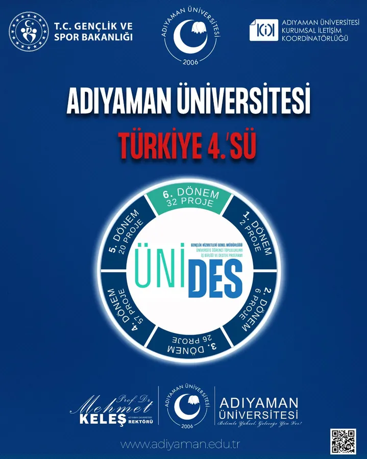 Üniversite bünyesinde faaliyet gösteren öğrenci toplulukları tarafından hazırlanan 187 proje arasından 32’si destek almaya hak kazandı. Bu sonuçla Adıyaman Üniversitesi, ÜNİDES 6. dönem kapsamında en fazla projesi kabul edilen üniversiteler arasında yer alarak önemli bir başarı elde etti.