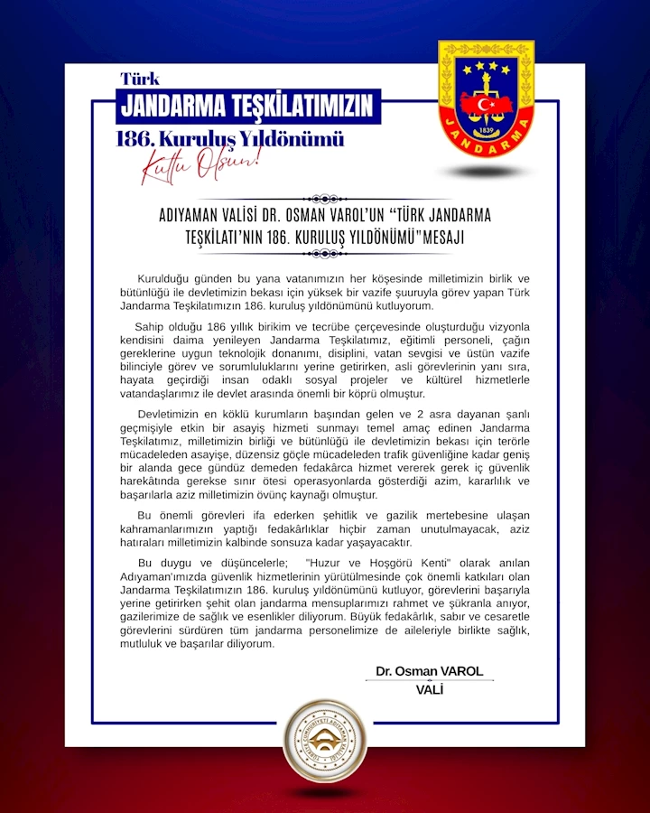 Mesajında, jandarma teşkilatının sahip olduğu köklü tarih ve deneyimle kendisini sürekli yenilediğine dikkat çeken Vali Varol, “Eğitimli personeli, teknolojik donanımı, disiplini ve vatan sevgisiyle görev yapan jandarma, asayişten terörle mücadeleye, düzensiz göçten trafik güvenliğine kadar geniş bir yelpazede fedakârca hizmet vermektedir” dedi.