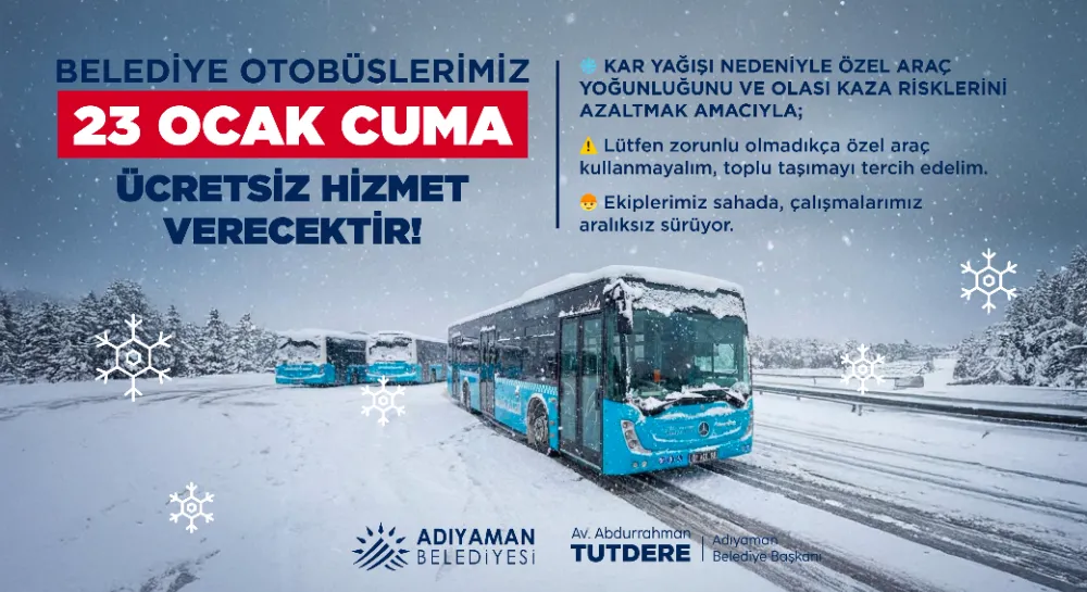 Konuya ilişkin yazılı bir açıklama yapan Belediye Başkanı Abdurrahman Tutdere, belediye ekiplerinin 7/24 sahada görev başında olduğunu belirterek, “Adıyaman’ımızda beklenen kar yağışı nedeniyle ulaşımda herhangi bir mağduriyet yaşanmaması adına 23 Ocak Cuma günü belediyemizin tüm toplu taşıma araçlarını ücretsiz olarak halkımızın hizmetine sunuyoruz. Amacımız, özel araç yoğunluğunu azaltarak trafik kazası risklerini minimize etmek ve toplu taşıma kullanımını teşvik etmektir” dedi.
