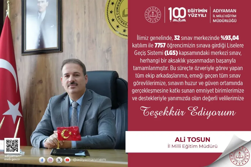 Tosun, Adıyaman genelinde 32 sınav merkezinde gerçekleştirilen sınava %93,04’lük bir katılım oranı ile toplam 7.757 öğrencinin girdiğini belirtti. Sınav sürecinde herhangi bir aksaklık yaşanmadığını vurgulayan Tosun, sürecin başarıyla tamamlanmasında emeği geçen herkese teşekkür etti.